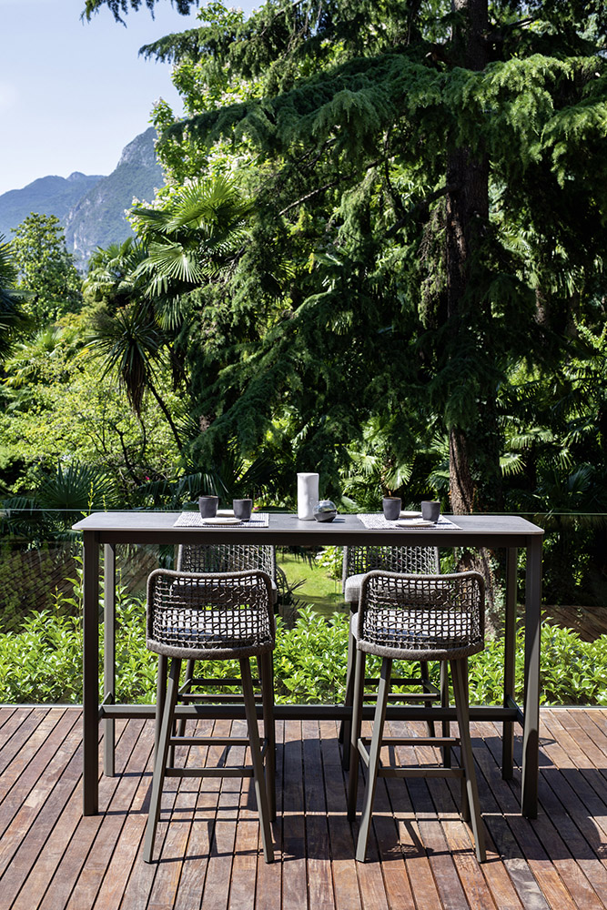 EMMA 吧檯椅腳可選擇鋁合金粉體塗裝或實心綠柄桑木。適宜於海洋高濕度的鹽霧環境和存在氯的泳池畔 (帶有可拆卸的墊套設計)。